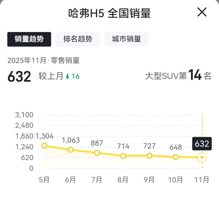 11月份,哈弗H5的销量为632辆,即便再往前推2月,它的销量数据也只有648辆(10月)、727辆(9月),依旧处于一种卖不动的局面。那么看到这情况也就不禁让我们想要问:哈弗H5作为一款堂堂大型SUV,为啥销量却起不来呢?其问题又到底出在哪?