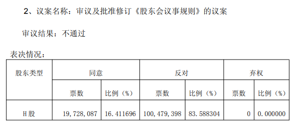 投票结果显示,《公司章程》修订案获得H股股东同意票480.31万股,占(出席会议有表决权H股股份总数)近4%;反对票1.15亿股,占比约96%。《股东会议事规则》修订案获得H股股东同意票1972.81万股,占比约16.41%;反对票1亿股,占比约83.59%。
