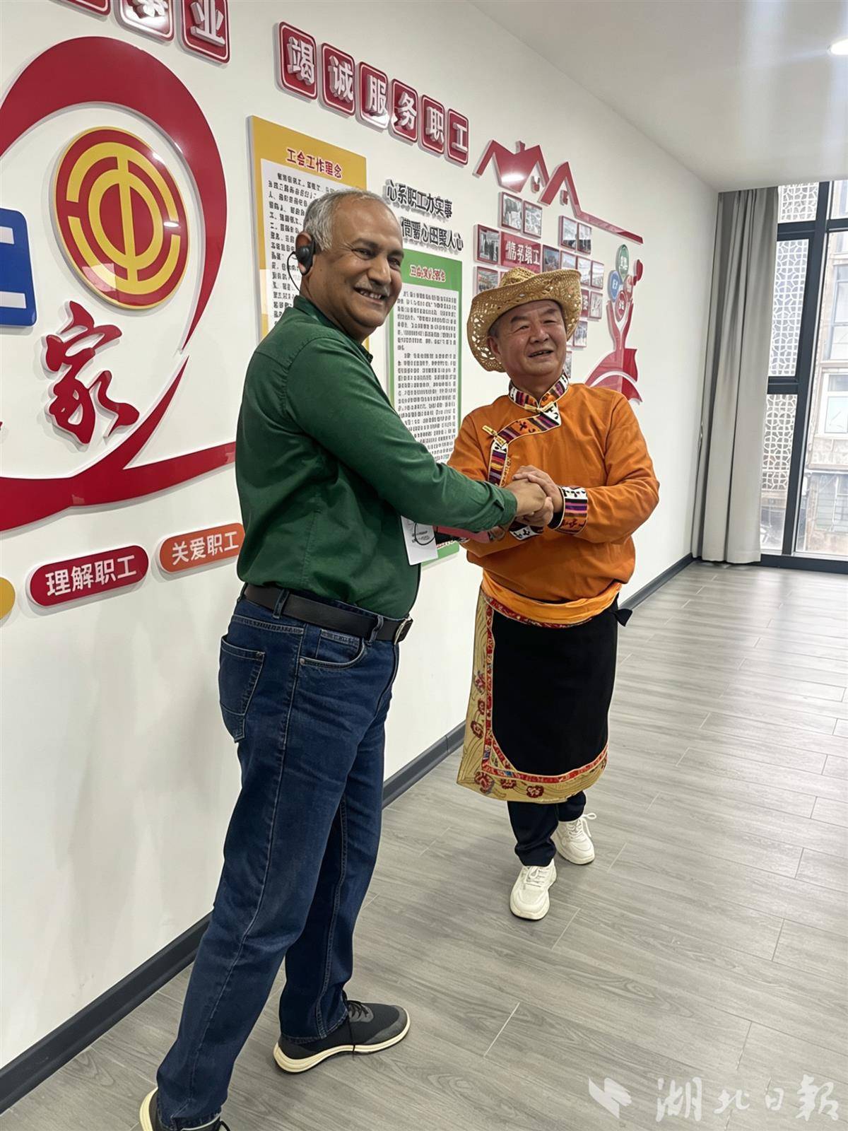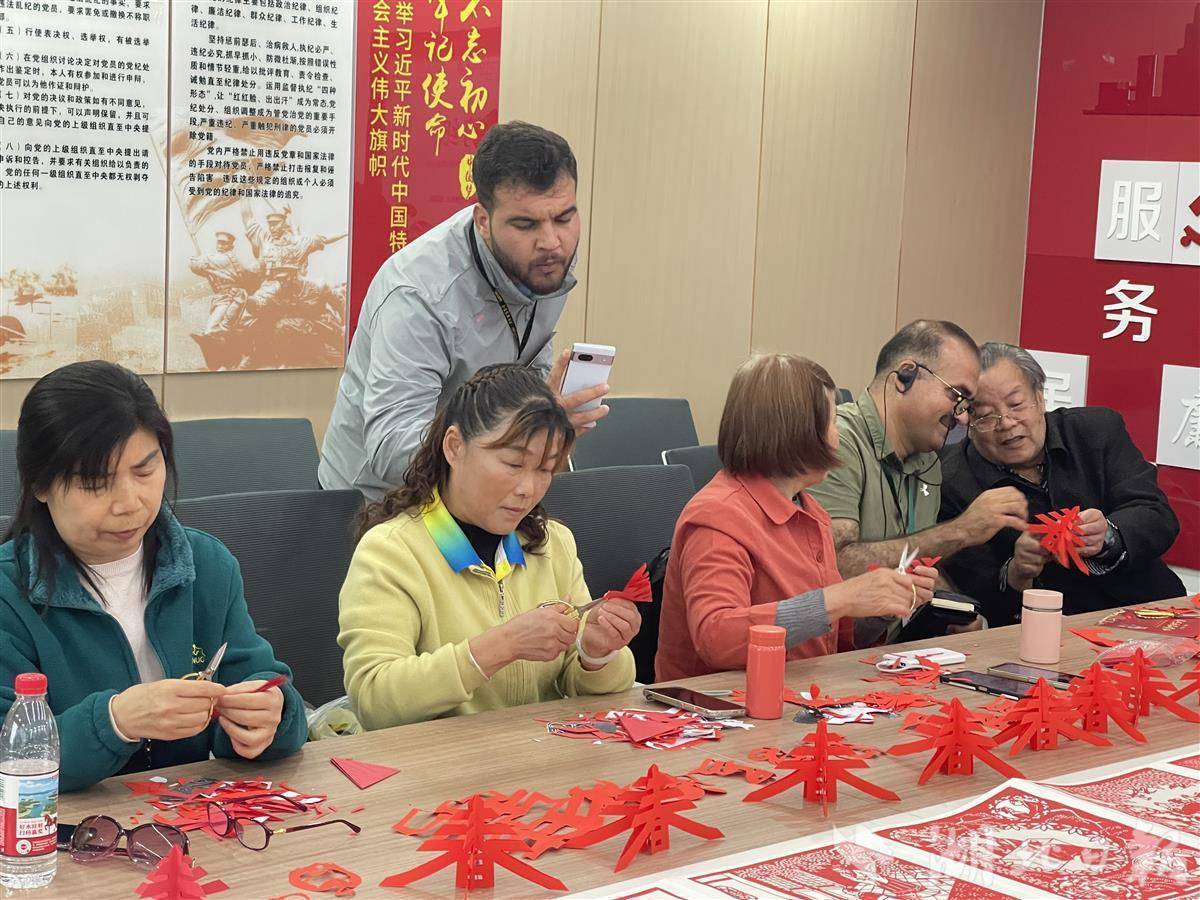 踏阶而上,党建会议室里正在展示国家级非物质文化遗产孝感雕花剪纸技艺。代表团成员们或举起手机拍摄记录,或拿起剪刀跃跃欲试地跟着学。虽然手法生疏,但专注的神情和完工后举起作品的喜悦,引来阵阵掌声。“我虽然不会写中文,但可以自己剪出来,我觉得很神奇。”阿布塔克新闻频道主持人拉希达·舒卡特拿着自己剪好的“春”字,与教她剪纸的居民合影,让友谊被一纸“剪”证。