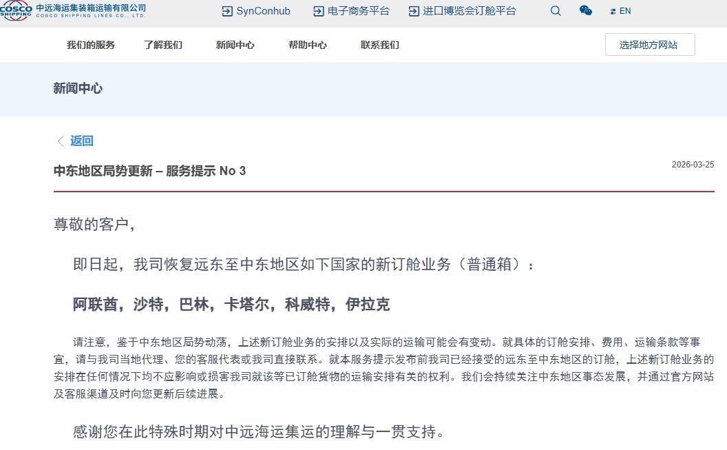 【大河财立方消息】3月25日,中远海运集运发布服务提示称,即日起恢复远东至中东地区如下国家的新订舱业务(普通箱),包括阿联酋,沙特,巴林,卡塔尔,科威特,伊拉克。