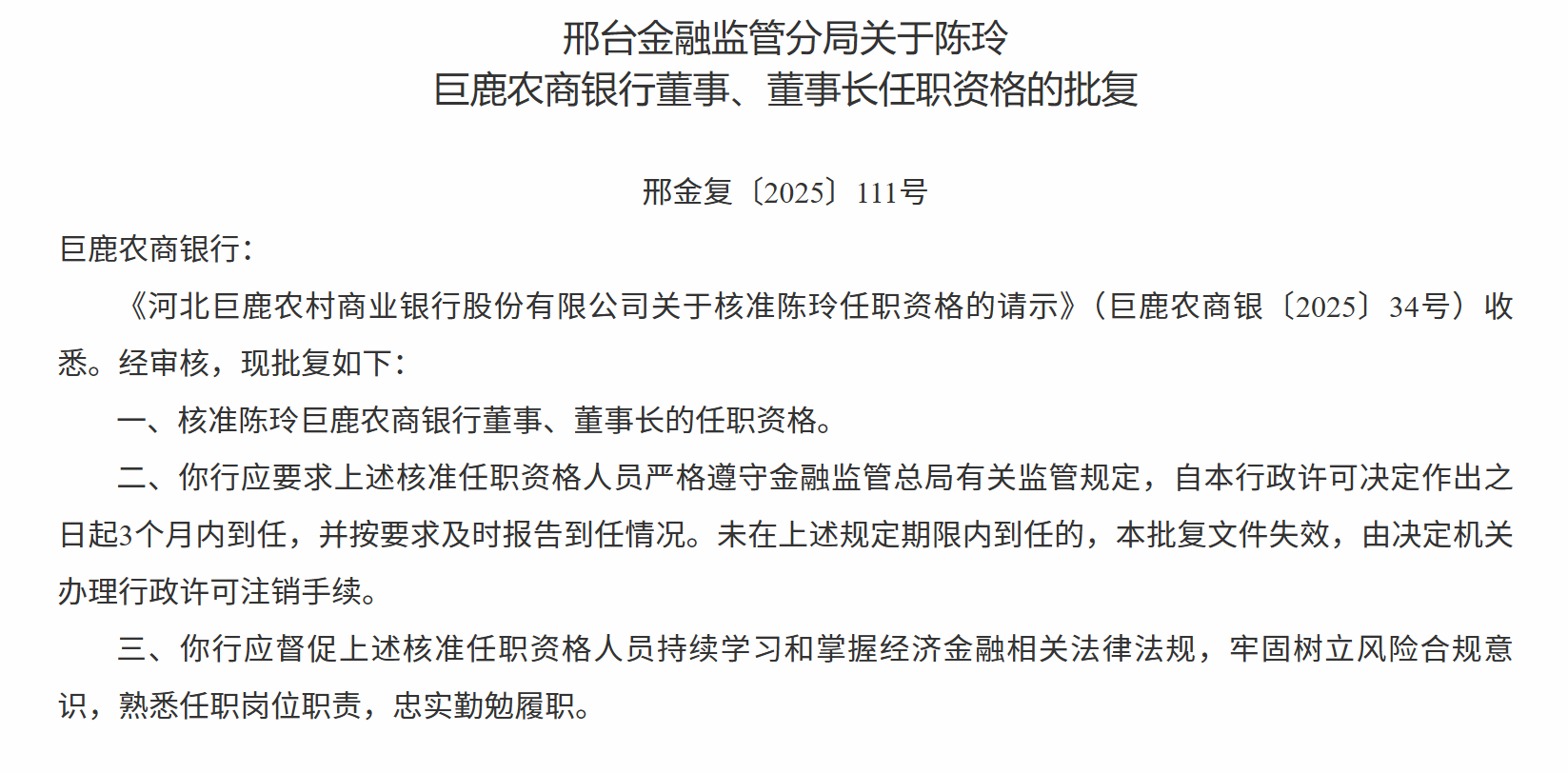 12月1日,邢台金融监管分局发布关于陈玲巨鹿农商银行董事、董事长任职资格的批复,核准陈玲巨鹿农商银行董事、董事长的任职资格。